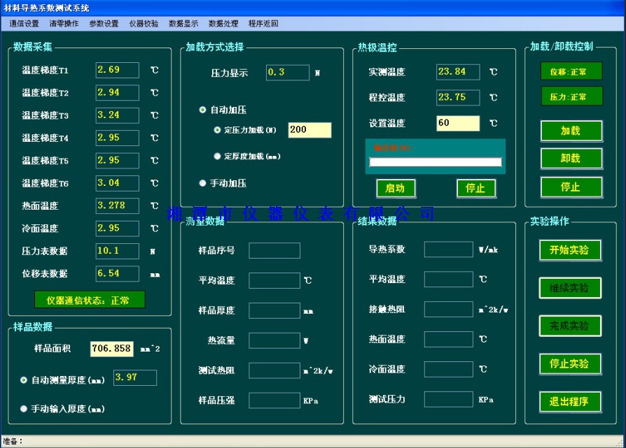 儀器特點:帶自動加壓(配用減速電機、高精度壓力傳感器、調(diào)速器),自動測厚裝置(配用高精度位移傳感器測量),并連計算機實現(xiàn)全自動控制。儀器采用6點溫度梯度檢測,提高了測試精度??蓹z測不同壓力下熱阻曲線,采用優(yōu)化的數(shù)學(xué)模型,可測量材料導(dǎo)熱系數(shù)熱阻以及界面處接觸熱阻等多個參數(shù)。